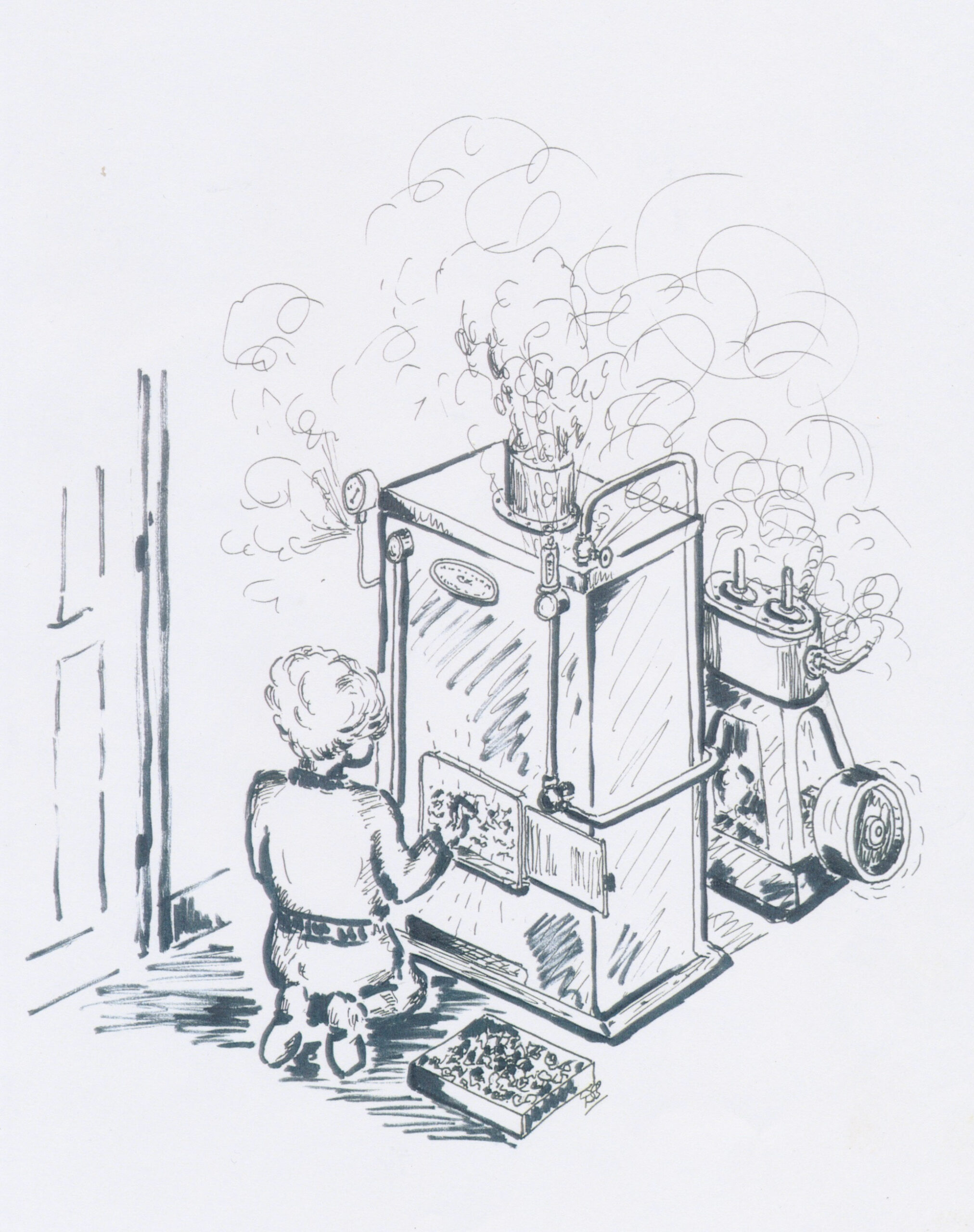 One adult figure could vaguely be observed leaping about, oil-can poised, in the steamy, smokey fog, yelling instructions, opening valves, operating boiler hand-feed pumps, controlling gas-burners, lubricating cross-head slideways, adjusting stuffing-boxes, keeping an eye on pressure-gauges, etc. and generally confirming the horrified guest’s opinion that this is indeed, the home of idiot parents and unbalanced offspring!