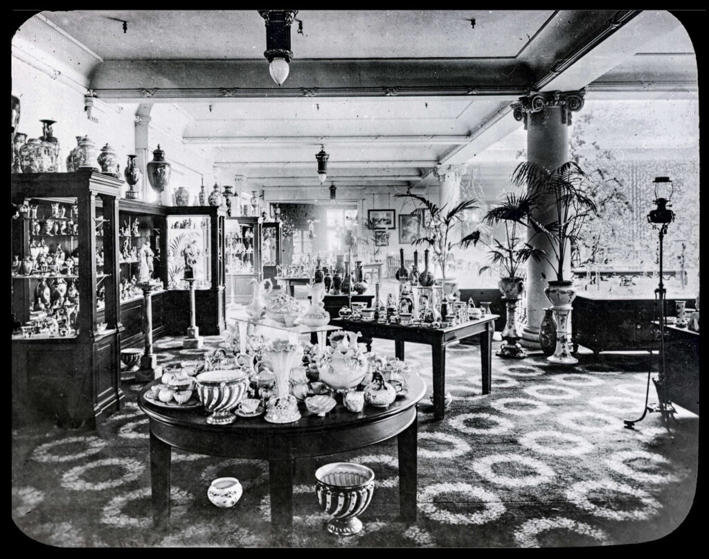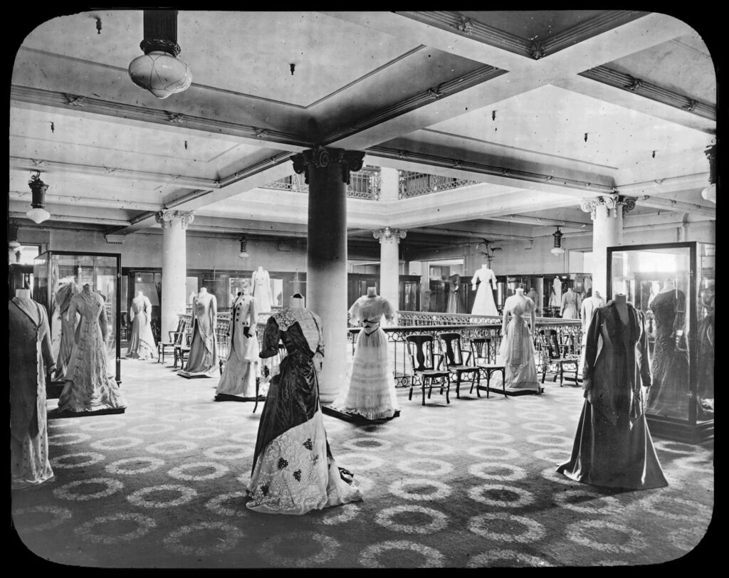 Compare the detail in the two interior photos4 below, showing Ladies Dresses and the China Dept in 1909, the year the store opened.