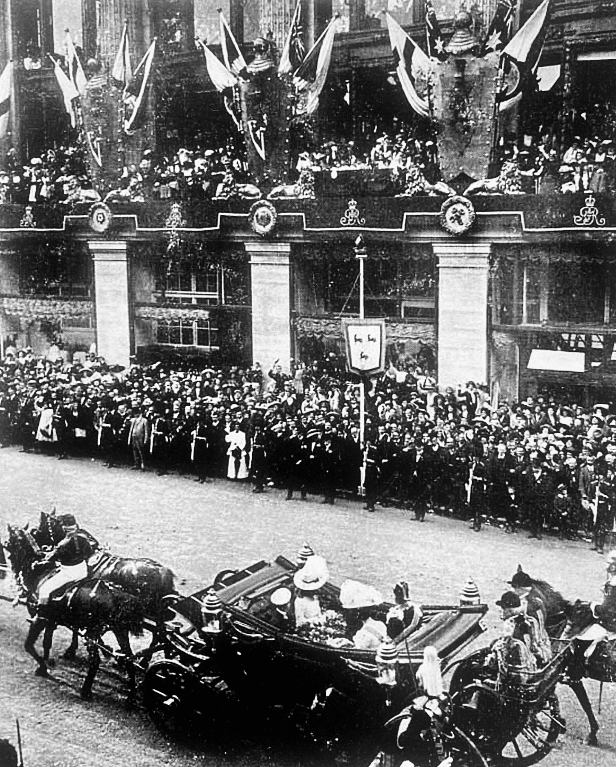 “In a clever move, the younger members of the extended Royal Family were invited to watch the procession from the first floor balcony. As the King and Queen drew level with the store, they turned and waved to assorted relatives —as if the store itself was receiving the Royal seal of approval.”