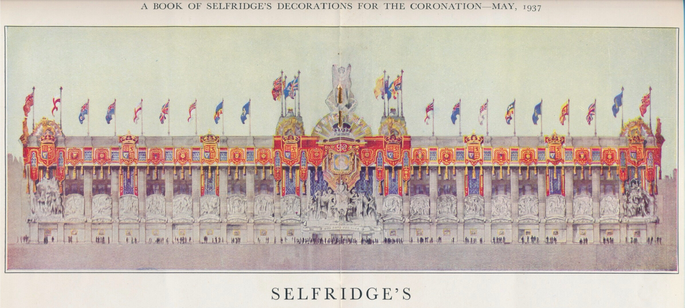 Selfridge’s decorations for the 1937 Coronation of George VI, Queen Elizabeth’s father, were even more grand than in 1911. That’s partly because the building itself had been massively enlarged — it now extended along Oxford Street for the entire block between Duke and Orchard Streets, almost three times its original 1909 frontage.