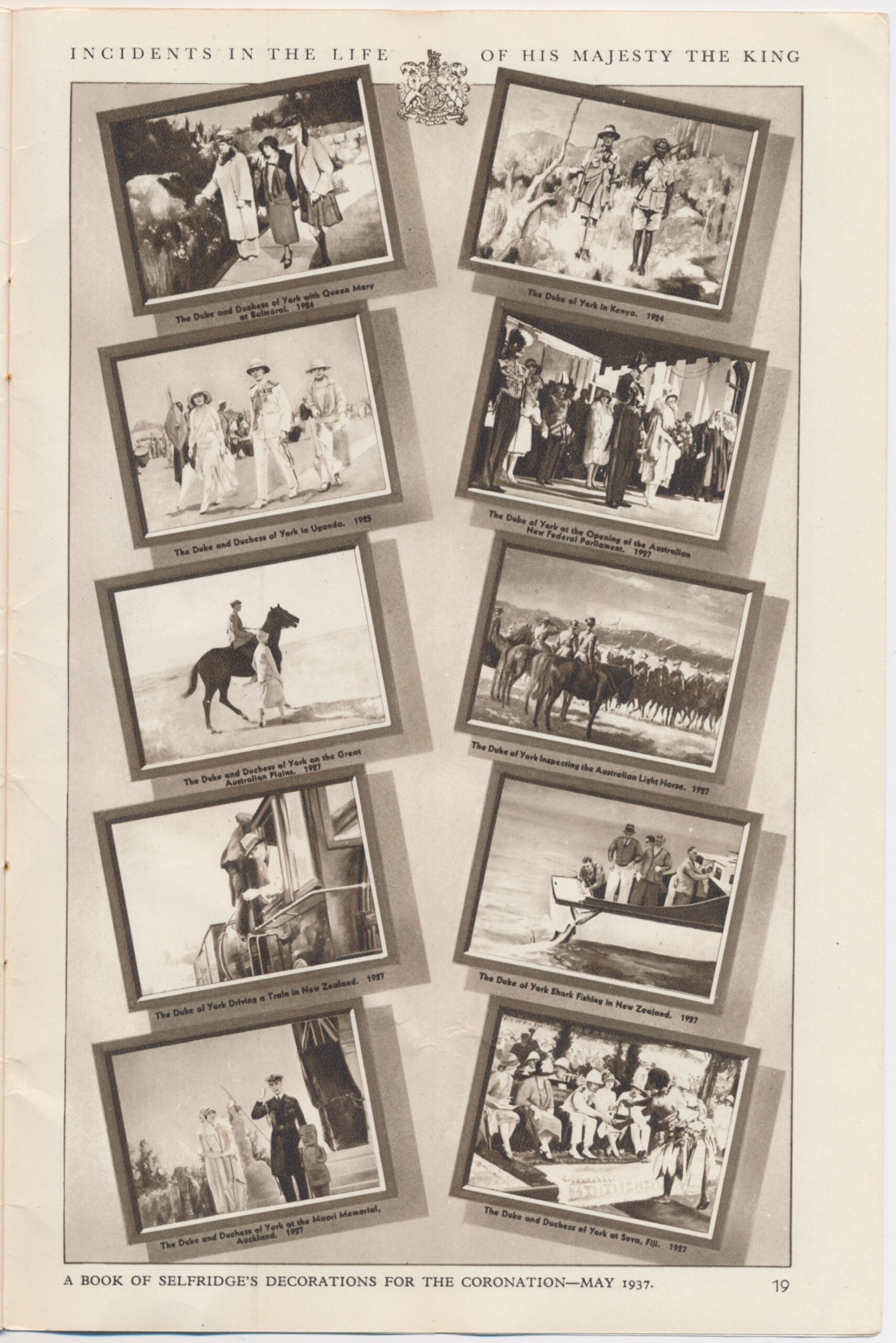 In the A5-sized 20-page, full colour, commemorative booklet published by Selfridges (price 3d) James’s 30 paintings rated 3 pages in sepia. I doubt that James would have called them his best work, but at 8’x6’ (2.4×1.8m) each they may have been his largest. New Zealand gets three mentions, in paintings showing the Duke of York (soon to be King) driving a train, shark fishing, and with the Duchess at the Maori Memorial, Auckland.