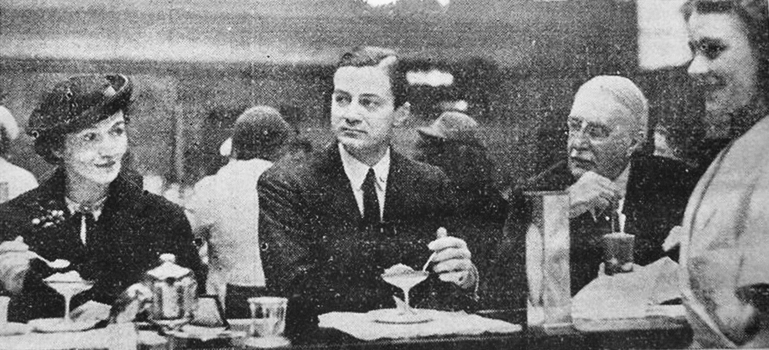 Gordon Selfridge’s promotional flair in a newspaper clipping — ‘the soda fountains at Selfridge’s, where Mrs. Janet H. Williams, from Columbus, Ohio (left of the picture) is obviously enjoying a refreshing break in a shopping morning. And she didn’t know (till our cameraman told her) that she was “partnered” by the Selfridges, father and son, who are very, very partial to ice-cream. “I love it,” said father. “So do I,” said son. “but I’m certain father likes it a lot more”.’