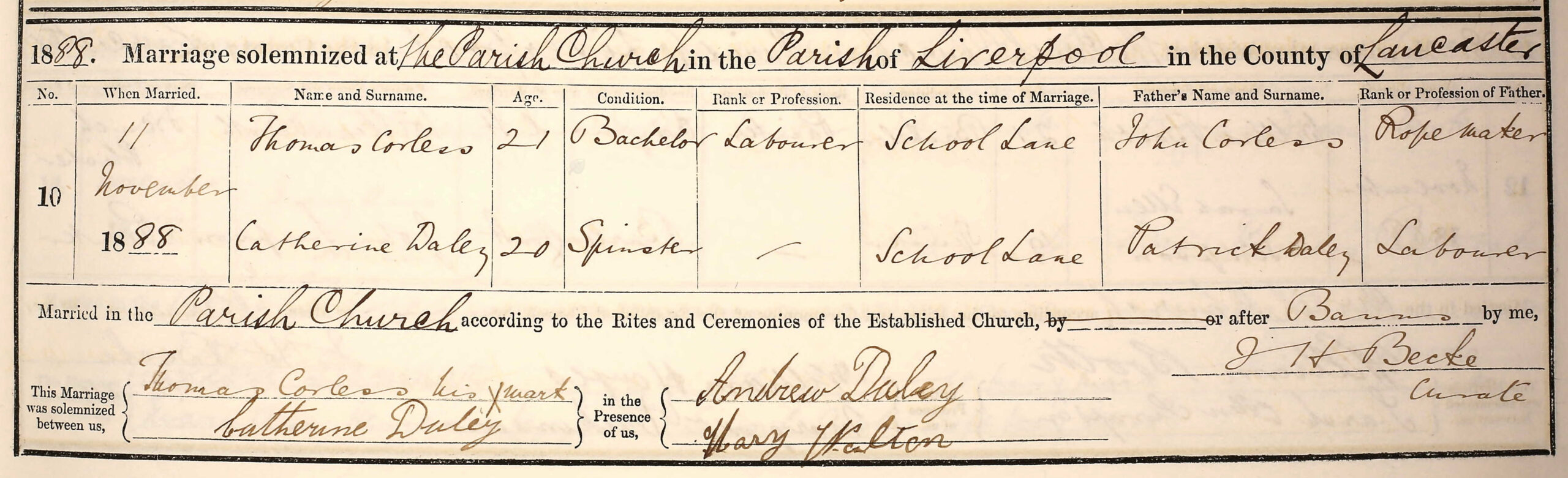 Once again there was Irish blood in the family. Thomas’s mother, Kate Kelly — Cliff’s Great-Grandmother — was Irish, and Thomas himself married into another Irish family, the Daleys. Thomas’s wife was also, confusingly, call Kate! I’m pretty sure both the Kellys and Daleys had migrated to Lancashire, and if Thomas and Kate the younger didn’t meet in Liverpool they certainly married there. Both families were living in School Lane in the centre of the city at the time.