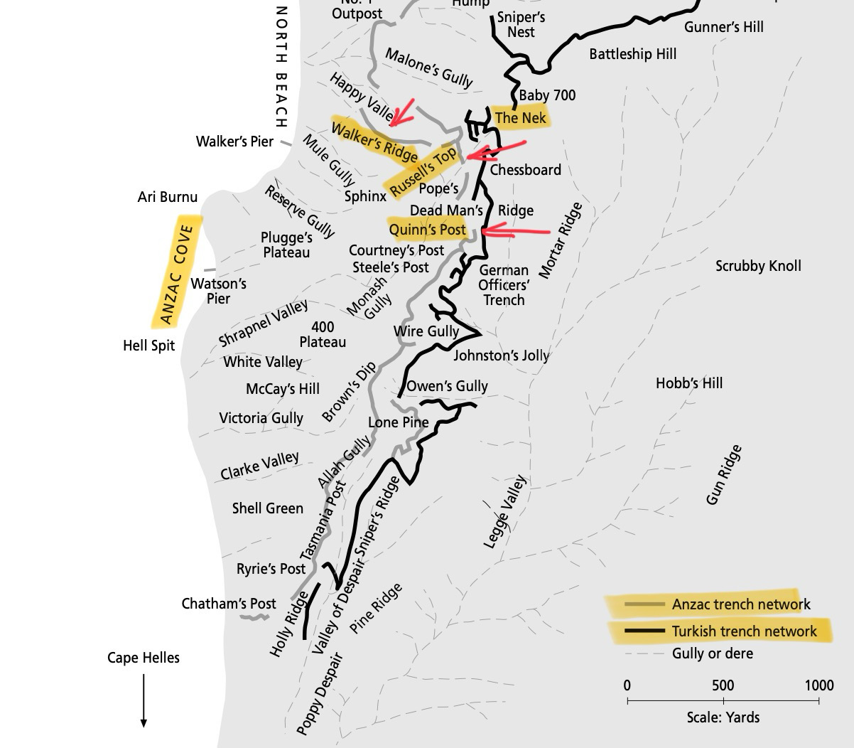 Stowers says that during the late afternoon the AMR were told to prepare to attack the first Turkish trench across the Nek, a narrow, heavily defended saddle of land the size of “two tennis courts”. It was cancelled at the last minute by their Commanding Officer, Lieutenant Colonel Mackesy. A similar attack the previous day had also been cancelled. Apparently Mackesy’s decision wasn’t popular with his superiors, but the men were understandably pleased that “colonial officers were more practical minded and saw past the senselessness of needless casualties on the battlefield.”